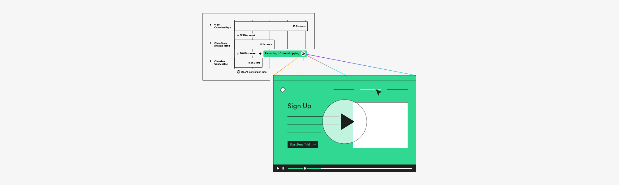A one-click way to watch the exact moments between top funnel events. The power to compare and contrast the user segments that make or break your product’s success.